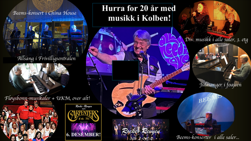 6. desember skal Rocke-Revyen ha sin 8. konsert i Kolben, men jeg skal også markere at dette er et 20 års jubileum for meg og mine konserter i dette unike huset: Fløysbonnmusikaler, elev-opptredener i UKM, også i biblioteket, div. Beems-konserter i sal 1, 2 og 4, og private arrangementer 3. etg. Ikke minst, en privat 70-års feiring med Beems hos China House. Gjennom året har jeg også regelmessige "sangtimer" hos Frivilligsentralen og en årlig "julesang-time" i foajeen. Jeg har spilt i alle salene i hele huset, unntatt kinosalen og garasjen....
